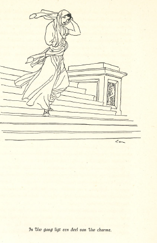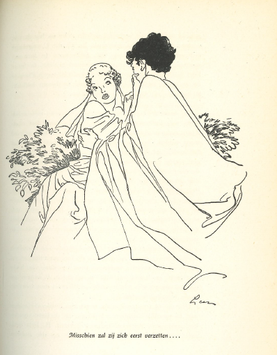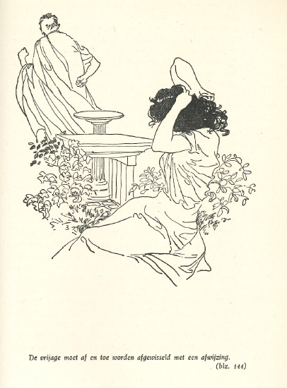 “Is bij ons mannen alom gebruikelijk niet zoo maar om liefde te verzoeken; de vrouw zal, als ze eenmaal door liefde bevangen is, gaarne een smeekende rol vervullen. In de weiden loeien de koeien immers om den stier en hinneken (sic) de merries om den hengst. Bij ons mannen is de hartstocht niet zoo hevig, noch leidt ze tot onzinnige dingen. Maar bij de vrouwen! De oude mythen kennen er tal van afschuwelijke voorbeelden van.”