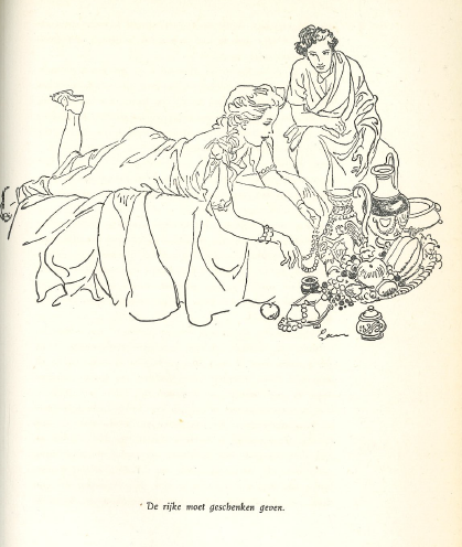 “Is bij ons mannen alom gebruikelijk niet zoo maar om liefde te verzoeken; de vrouw zal, als ze eenmaal door liefde bevangen is, gaarne een smeekende rol vervullen. In de weiden loeien de koeien immers om den stier en hinneken (sic) de merries om den hengst. Bij ons mannen is de hartstocht niet zoo hevig, noch leidt ze tot onzinnige dingen. Maar bij de vrouwen! De oude mythen kennen er tal van afschuwelijke voorbeelden van.”