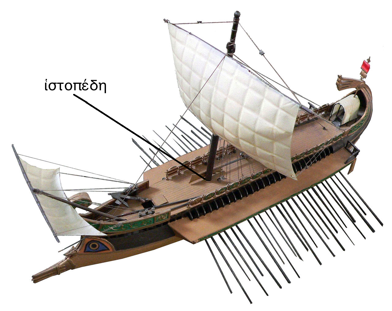 Een andere bekende passage waarin ἱστοπέδη voorkomt, is te vinden bij de dichter Alcaeus van Lesbos (6de eeuw v.C.), wanneer hij het heeft over een schip dat in een storm is terechtgekomen:
