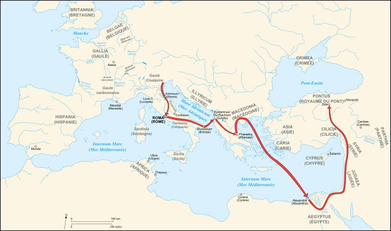 Kaart met de bewegingen van Caesar aan het begin van de burgeroorlog met Pompeius