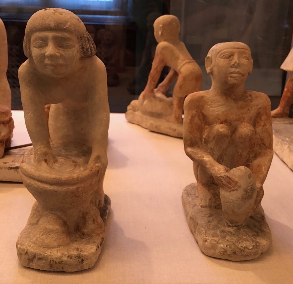 Vrouwen speelden een belangrijke rol in de Egyptische bierindustrie. Links zien we hoe het bier gefilterd wordt; rechts plaatst een man een lemen stop op een bierkruik