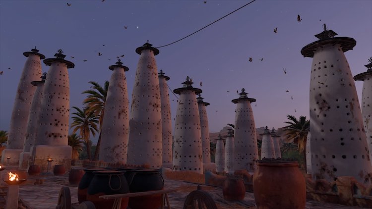Deze gewassen zijn ook terug te vinden op de vele markten die de steden en dorpen in ‘Assassin’s Creed: Origins’ rijk zijn. Het dieet van de gemiddelde Griek en Egyptenaar bestond inderdaad vooral uit groenten, brood en vis, zoals de game het afbeeldt. De meeste van de producten die je op de markt vindt, zou je ook in Ptolemaeïsch Egypte kunnen aantreffen: sla, komkommers, dadels, druiven, perziken, allerlei soorten peulvruchten, honing, brood, vis, olie, papyrus, keramiek, textiel, en zelfs vlees. Appels, peren en citrusvruchten zijn dan weer meer iets van de Romeinse tijd, en in het bijzonder mango’s en oranje wortels zijn toch wel erg anachronistisch.